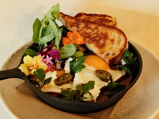Grass-fed beef mince simmered in a rich house-made tomato sauce, with eggs, jalapeños & goats cheese. Served with organic sourdough. GFO
