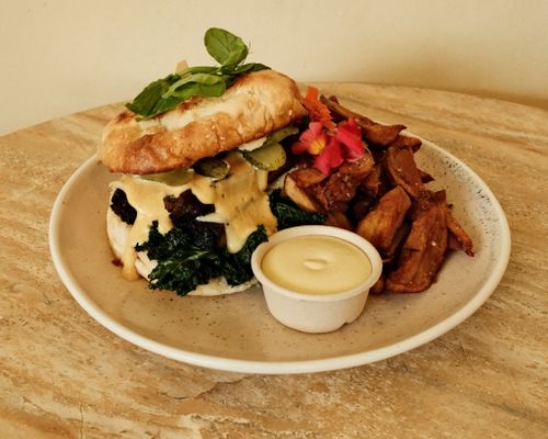 Two softly poached eggs on sourdough, kale, finished with our silky house-made hollandaise. Served with your choice of side: GFO, VO