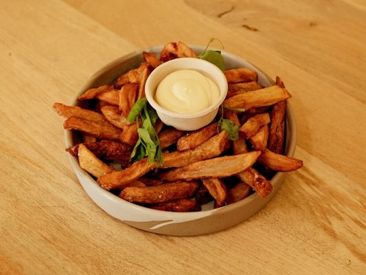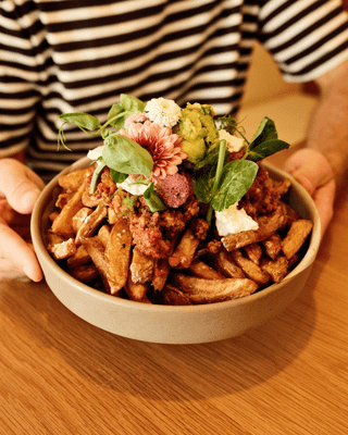 Tallow fries topped with grass-fed beef mince simmered in a rich tomato sauce, smashed avocado, sweet corn, red onion, dill and goats cheese. GF, DF