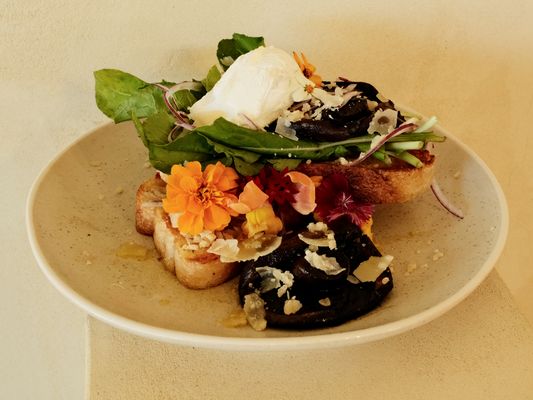 Organic sourdough with sautéed truffle mushrooms, fresh rocket, onion, halloumi & a poached. V, GFO, DFO, VGO