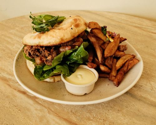15-hour slow-cooked beef brisket with house-made paprika aioli, melted cheese, caramelised onion, sauerkraut, served on an organic turkish roll with a side of our house-made, tallow chips.
