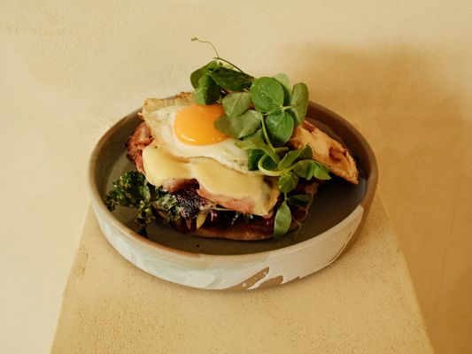 Toasted organic sourdough with 15-hour slow cooked beef brisket, mustard, jalapeños, caramelised onion, swiss cheese & sauerkraut.